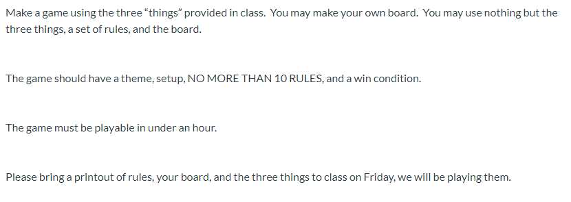 As soon as development started, we were already under specific constraints. These included only having 10 rules, using only the materials we choose, and the game needing to be under an hour in length. Along with these, a story, theme, setup, and win condition needed to be present in the rules. A board was also an optional piece that could be created.